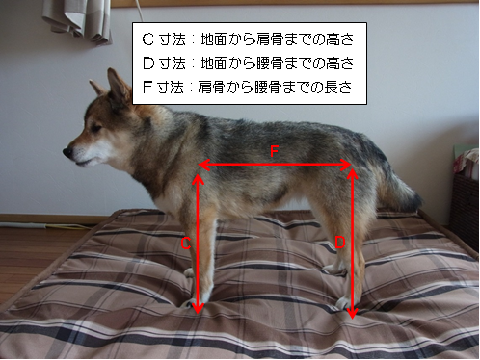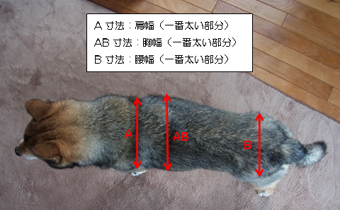 上記の写真を参考にワンちゃんのご採寸をおこなって下さい。 ご採寸は必ず2人以上でおこなっていただき、 お写真はメジャーがなるべく正面となるような位置で <お知らせいただく情報> ・採寸データ:A/AB/C/D/F/G/Hの寸法とA/B/C/D/Fのご採寸時のお写真